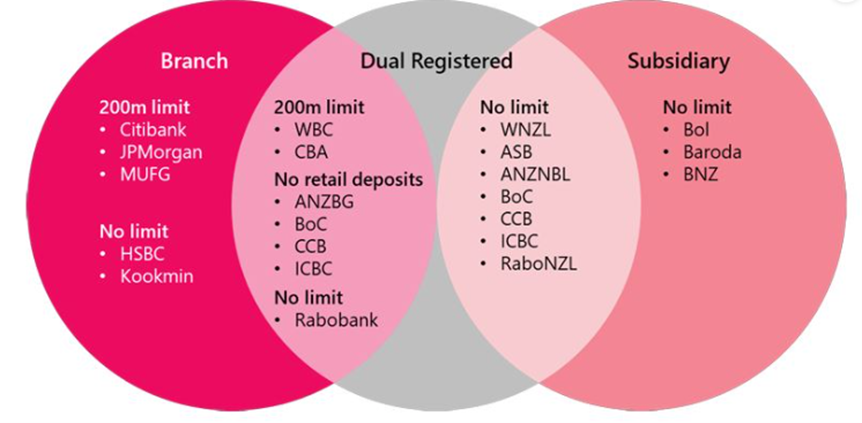 Foreign-owned banks are registered either as branches or subsidiaries of their global parent. In its recent review[1], the RBNZ limited the maximum size of a ‘branch’ to $15 billion in total assets.