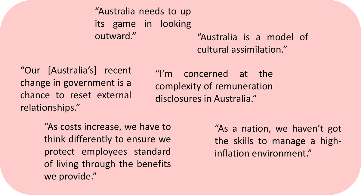 Like NZSA, the ASA benefits from strong relationships with many senior business leaders. The conference closing session was a panel session featuring Paul O’Sullivan (Chair, ANZ), Elizabeth Proust (Director, Lendlease) and John Bevan (Chair, Bluescope Steel). The session focused heavily on the personal; backgrounds of each Chair, but their quotes below perhaps offer a snapshot into both the opportunity and challenge facing Australian business…