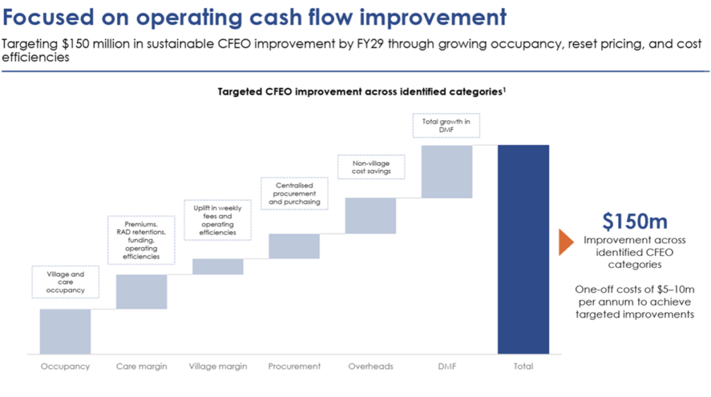 Ryman was clear that changes in its product mix will underpin near-term growth, with $150m in cashflow growth by FY29. But it also signalled that this transition towards resilient earnings was building a foundation for longer-term growth, reinforced by a new dividend policy set at a minimum of only 20% of cashflow from existing operations (CFEO).