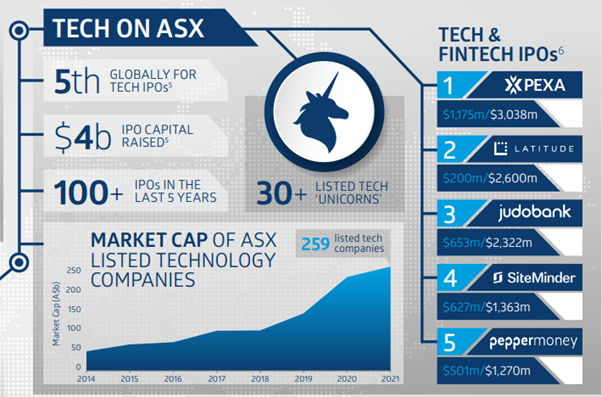 Tech is now the second largest sector now listed on ASX, with over 2501 companies. ASX also has the fourth-highest number of tech IPOs of any exchange in the world, with $4 billion of IPO capital raised over the past five years, so that it now boasts 30 tech unicorns