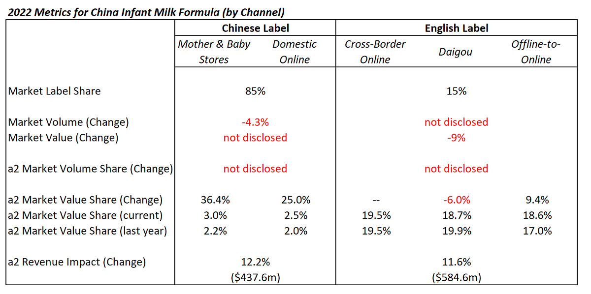 - What is the volume share of a2’s products? This is particularly apparent in the relative difference between the growth in value share of Chinese label sales for a2 (20%-36%) and its lower absolute revenue growth (12%). While some may be explained by the 4.3% market volume decline, linked to birth rate, has there been an additional loss of volume share suffered by a2 in these channels?