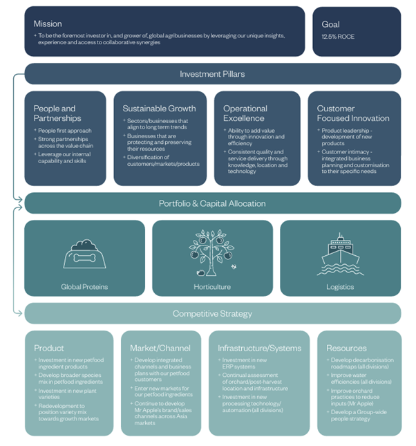 Its strategy is underpinned by its three key operating divisions: Horticulture, Logistics and Global Protein. There is a good one-page summary of the company strategy included in the Annual Report: